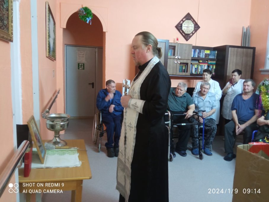 Иерей Михаил отслужил молебен, поздравил постояльцев учреждения с Рождеством Христовым. В конце всем были розданы сладкие подарки.