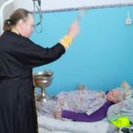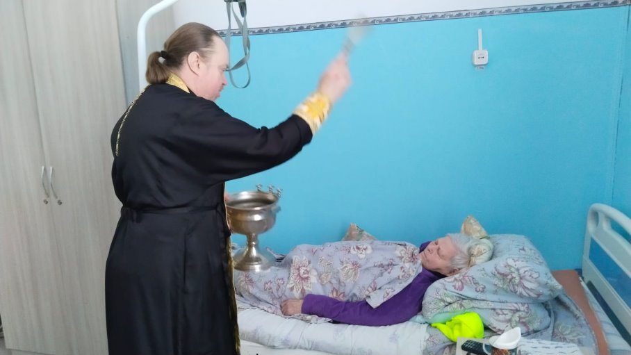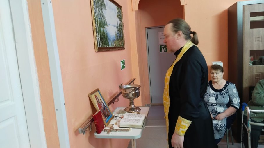Иерей Михаил отслужил молебен, побеседовал с постояльцами дома милосердия о Таинствах Исповеди и Причастия и рассказал о смысле прочтенного Святого Евангелия в прошедшее воскресение (1Кор.8:8–9:2; Мф.25:31–46).