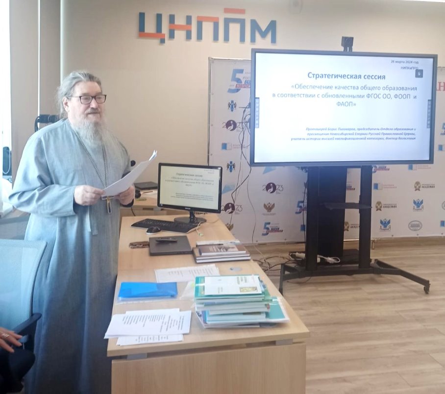 На сессии выступил с докладом «Обеспечение качества общего образования в соответствии с обновленными ФГОС ОО, ФООП и ФАОП» протоиерей Борис Пивоваров, председатель отдела образования и просвещения Новосибирской Епархии РПЦ.