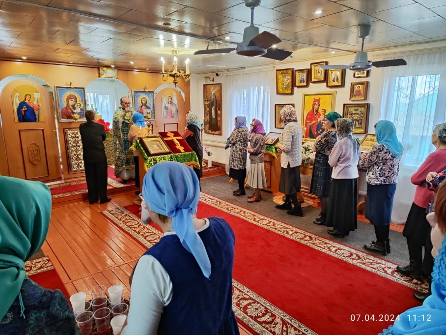 Верующие храма во имя прп. Сергия Радонежского р. п. Краснозерское встретили праздник Благовещения Пресвятой Богородицы всенощной службой с освящением хлебов и выносом Креста Господня и поклонением ему 6 апреля.