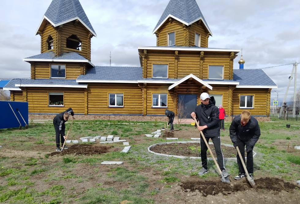 А в день Великого Четверга после окончания занятий пришли в храм учащиеся – юноши 9 класса с педагогом и помогли мужчинам вскопать клумбы под цветы. Мужчины залили бетонное снование и установили бордюры вокруг клумб.