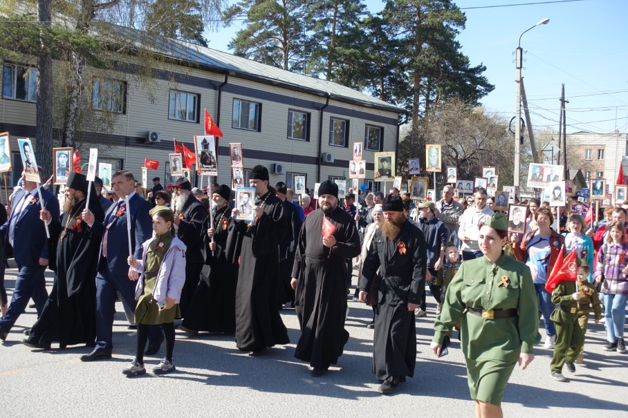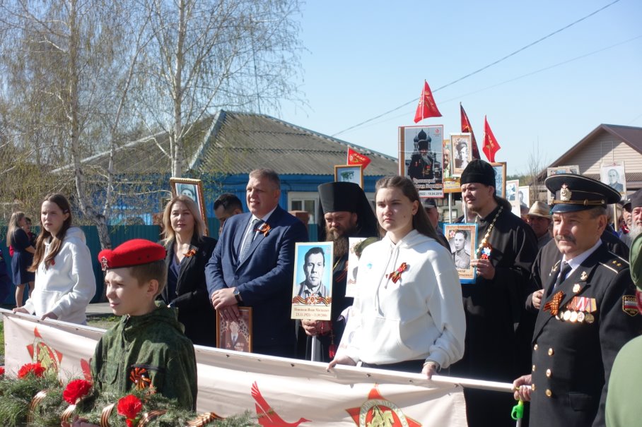 И сегодня их потомки — потомки военного поколения: дети, внуки, правнуки плечом к плечу шагали вместо своих отцов, матерей, дедов и прадедов, с честью неся их портреты в руках. Колонна двигалась под аккомпанемент песен военных лет — герои, завоевавшие Победу, шли парадом по поселку под звуки песен и бравых маршей, как и положено победителям. Вот она — связь поколений!