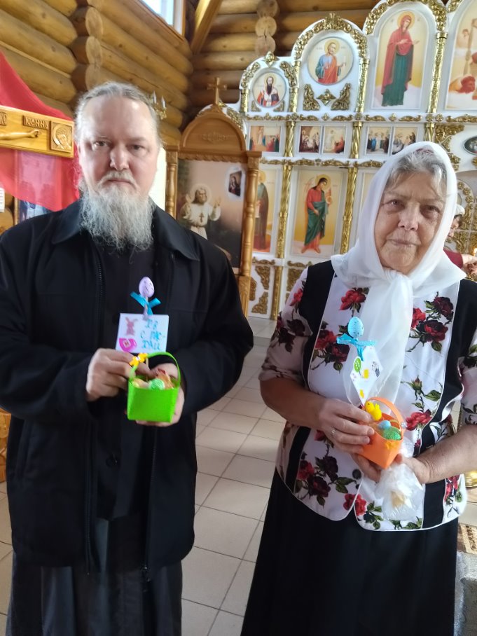 Дети с большой радостью показали иеромонаху Мефодию свои пасхальные изделия, рассказали, что подарят они их своим бабушкам, родителям. А несколько ребят подарили свои корзиночки священнику и пожилым прихожанкам, пришедшим в храм.