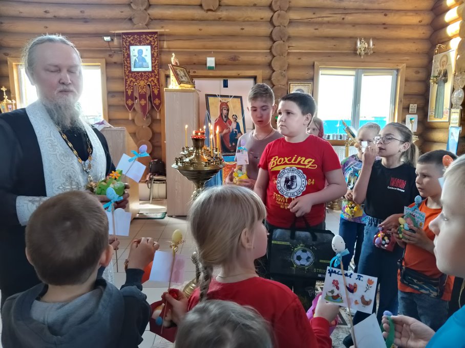 Настоятель прихода иеромонах Мефодий сказал приветственное слово, пояснил детям, что Пасха – главный праздник православных христиан.