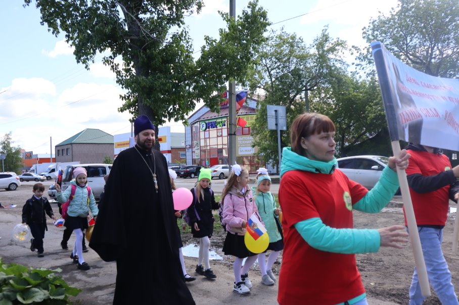 Начался праздник традиционным шествием школьников с буквами славянской азбуки, которые несли обучающиеся школ, каждая группа школьников следовала во Дворец Культуры из своей школы, таких групп было четыре — по количеству школ города, к одной из таких групп обучающихся присоединился и иеромонах Мелхиседек.