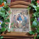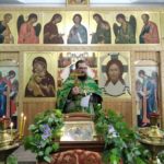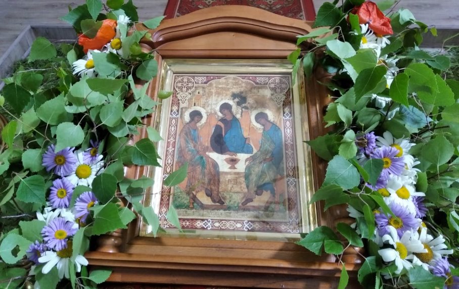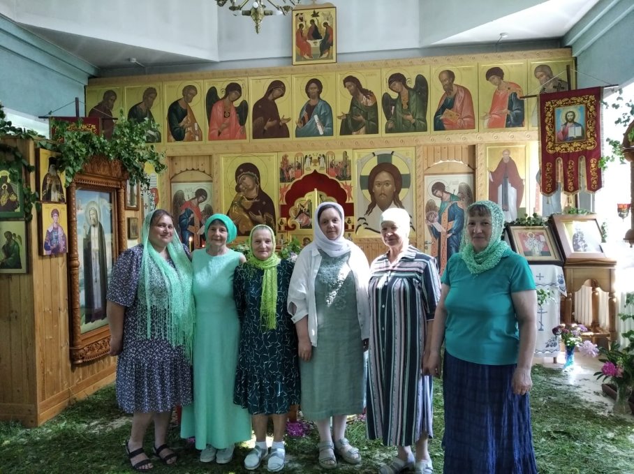 Накануне, перед вечерним богослужением, прихожане традиционно приготовили храм к празднику: пол застелили свежескошенной пахучей травой, иконы украсили веточками берез и цветами.