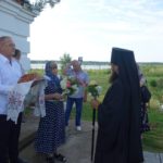 12 июля/пятница. В день прославления первоверховных апостолов Петра и Павла Преосвященнейшего Филиппа епископа Карасукского и Ордынского на паперти храма на острове с. Чингиссы Ордынского района под колокольный звон тепло встречали глава поселка и прихожане с хлебом, солью и букетом белых хризантем.