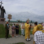 По завершении Литургии у памятника святому равноапостольному князю Владимиру на Новособорной площади г. Купино был отслужен молебен, по окончании которого батюшка обратился к молящимся с напутственным словом, в котором рассказал о предуготовительных периодах, предшествовавших этому событию, и о том, что именно в православии произошло становление русской государственности.