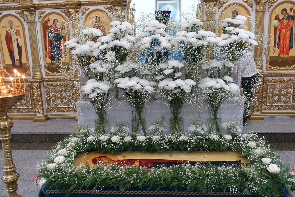 Накануне за всенощным бдением из алтаря на середину храма была вынесена Плащаница Пресвятой Богородицы и положена на возвышенное место, украшенное цветами.