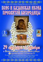 29 сентября в 10.00 в Вознесенском кафедральном соборе состоится торжественная встреча святынь Русской Православной Церкви — ковчега с частью Пояса Пресвятой Богородицы и частицами мощей святых праведных Иоакима и Анны и новообретенной чудотворной Казанской иконы Божией Матери.