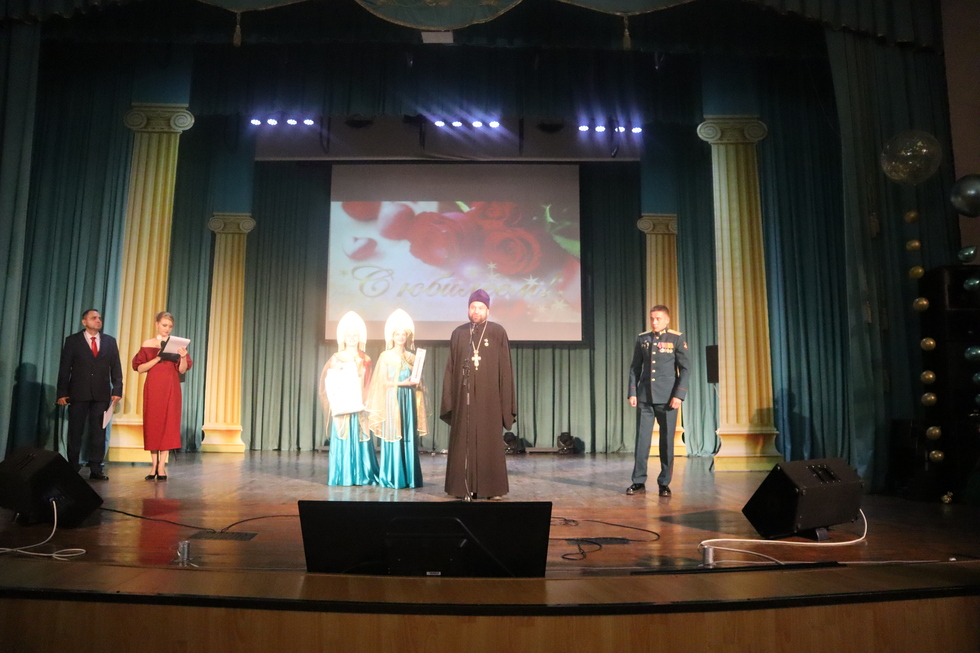 Затем на сцену Дворца Культуры поднялся участник СВО, капитан Игорь Самойлов, к которому батюшка обратился с напутственным словом, в котором отметил, что в настоящее время по территории нашего Отечества проходит крестный ход с древней чудотворной Казанской иконой Божией Матери, прибывшей из Москвы, поясом Пресвятой Богородицы и частицами мощей свв. праведных богоотцов Иоакима и Анны, родителей Пресвятой Богородицы и напомнил, что Казанская икона Божией Матери не раз спасала наше Отечество от захватчиков и преподнес капитану в благословение пояс «Живый в помощи Вышнего…» и икону Божией Матери «Казанская». А также напомнил, что самое главное наше чаяние — это чаяние о грядущей победе над злом неонацизма и возрождающего фашизма.