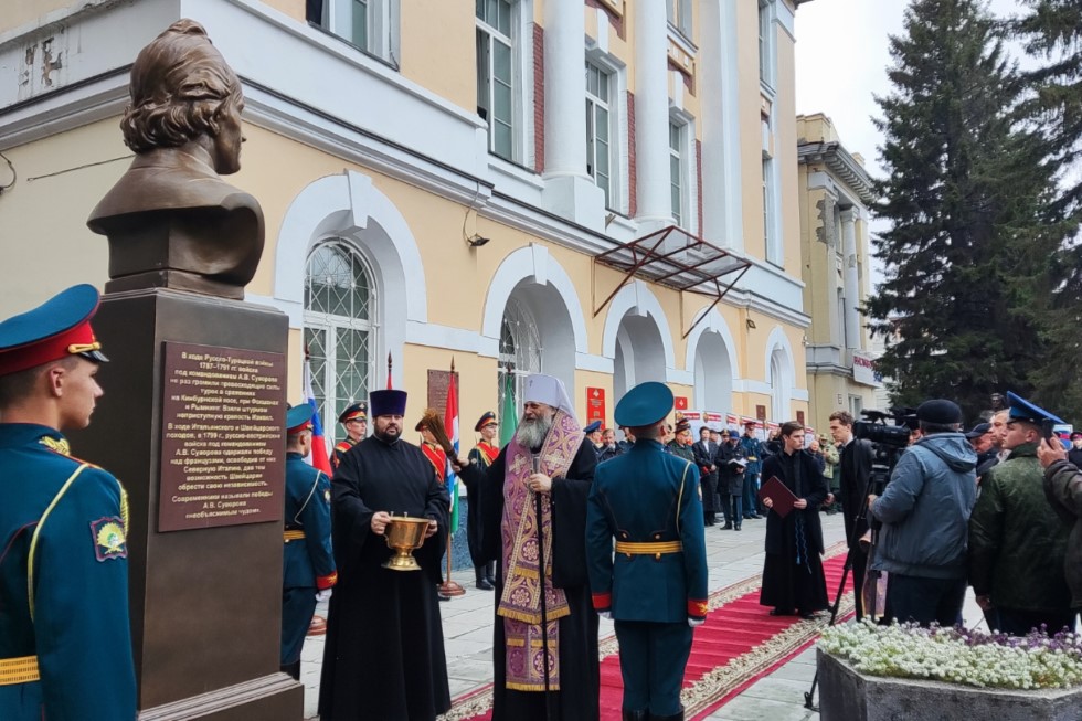 27 сентября у Дома офицеров Новосибирского гарнизона состоялась торжественная церемония открытия бюста А.В. Суворова. Чин освящения памятника совершил митрополит Новосибирский и Бердский Никодим.