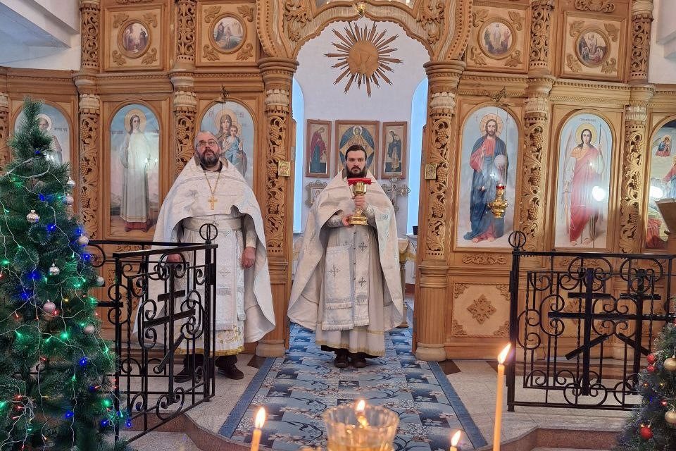 В день праздника Рождества Христова в храме в честь Успения Пресвятой Богородицы р. п. Чистоозерное состоялась Божественная литургия соборным служением.