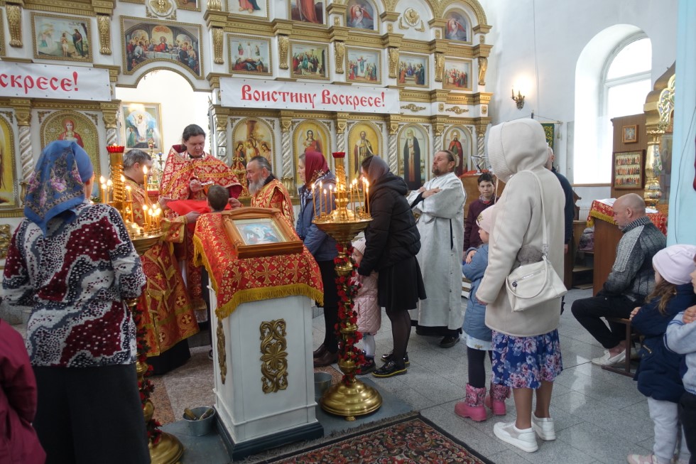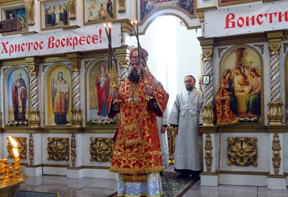 По окончании Божественной литургии под колокольный звон состоялся пасхальный крестный ход вокруг собора. В архипастырском слове по его завершении Владыка поздравил всех с воскресным днем — женскую половину собора с праздником св. жен-мироносиц, подчеркнув высоту и важность женского служения в Церкви.
