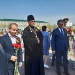 Иерей Илия обратился с поздравительной речью к жителям Чистоозерного района и почтил память погибших воинов возложением цветов к Вечному огню.
