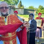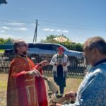 После Литургии и водосвятного молебна был совершен крестный ход с пасхальными песнопениями и благословением на храм сей, «на весь сию», на люди и благословенную землю, в которую отцы-основатели принесли веру православную.