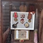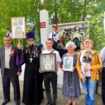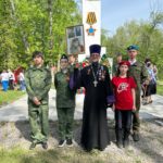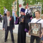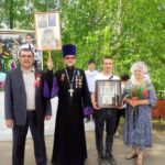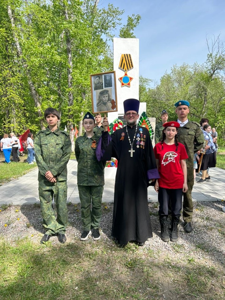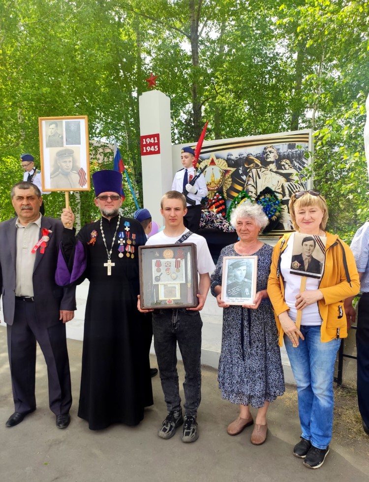 В день праздника Великой Победы настоятель храма во имя прп. Сергия Радонежского р.п. Краснозерское протоиерей Евгений Зверев принял участие в двух митингах и шествиях «Бессмертного полка» в селе Половинном. С собой принес семейные артефакты: орден Отечественной войны деда Михаила, медаль русско- японской войны, немецкий штык, нож, трофейную бритву, икону, прошедшую всю войну — эти свидетели того славного времени — героической победы над сатанизмом.
