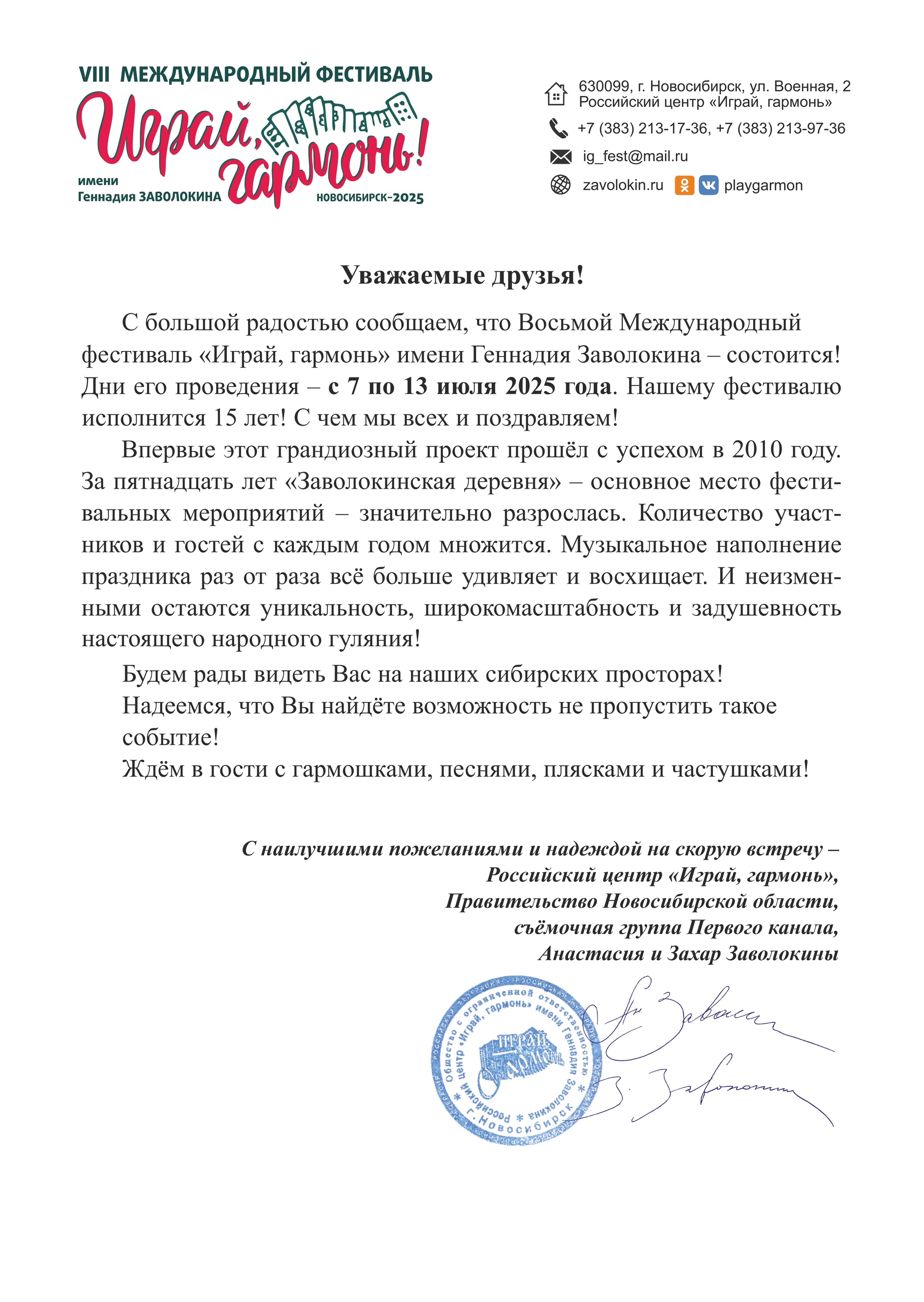 С 7 по 13 июля 2025 года состоится Международный фестиваль «Играй, гармонь» имени Геннадия Заволокина. Новосибирская область, Ордынский район, село Новый Шарап. В этом году исполняется 15 лет.