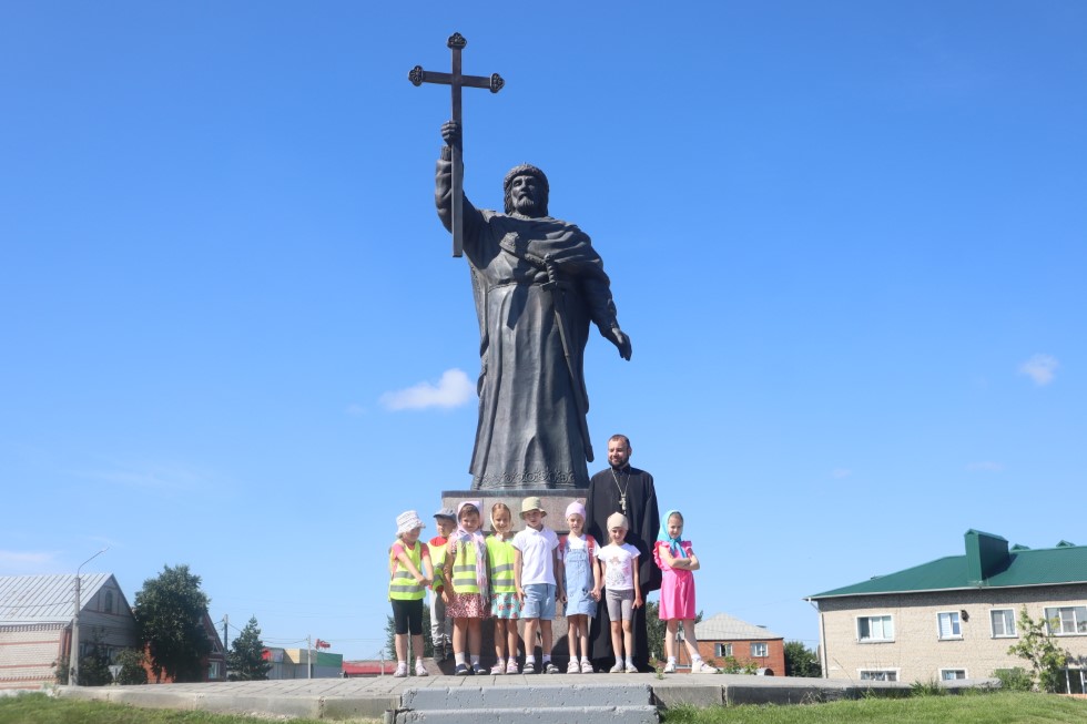 По завершении беседы батюшка и воспитанники детского сада посетили памятник святому равноапостольному великому князю Владимиру – Крестителю и Просветителю Руси на Новособорной площади г. Купино.
