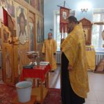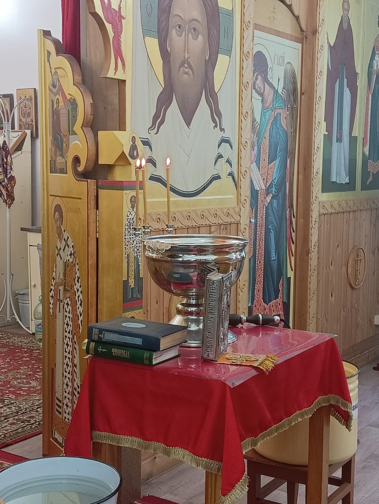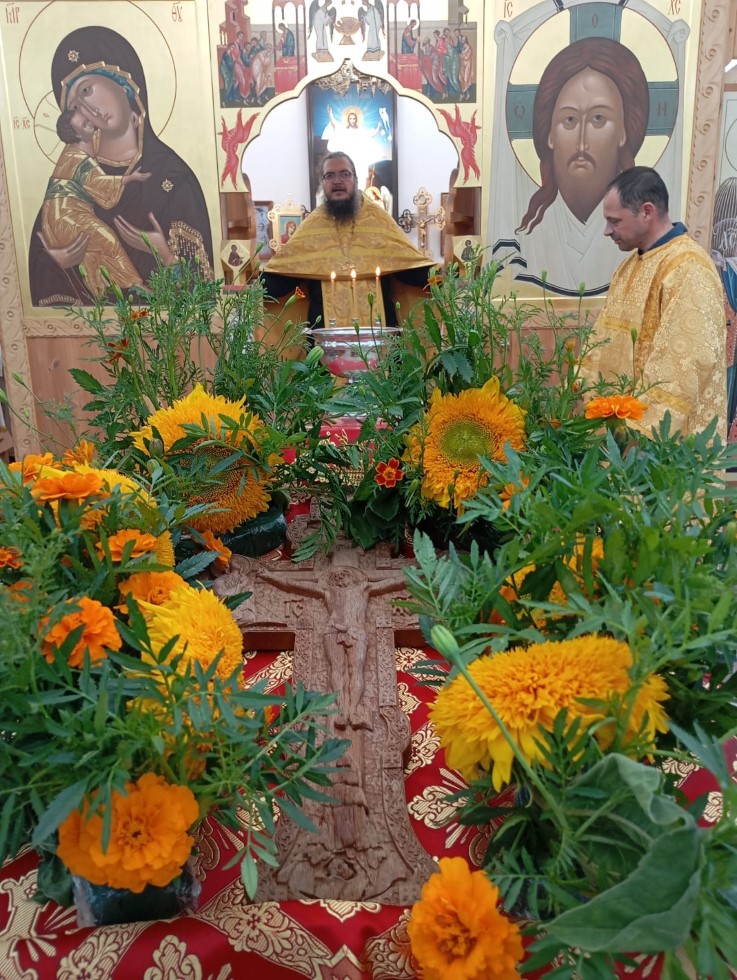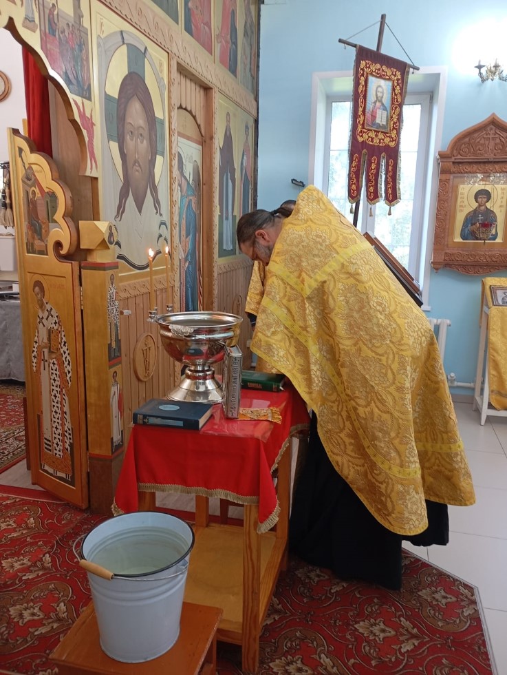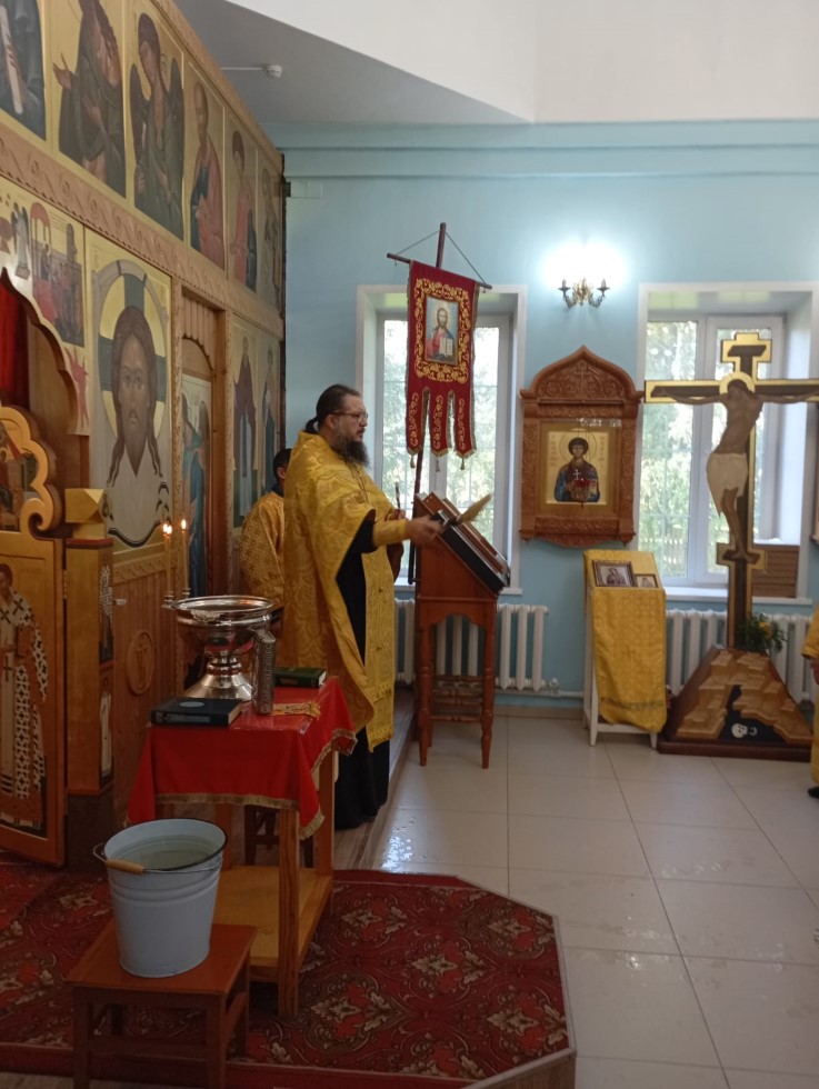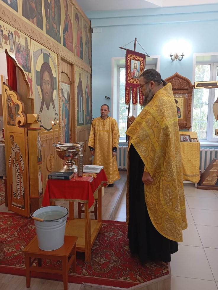 14 августа 2025 г., в день празднования Происхождения (изнесения) Честных Древ Креста Господня, в храме во имя преподобного Сергия Радонежского с. Довольного протоиерей Андрей Гусев отслужил водосвятный молебен и благословил прихожан на Успенский пост.