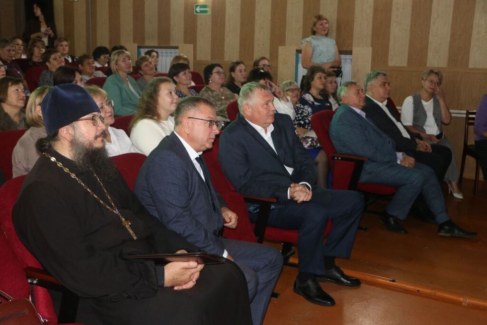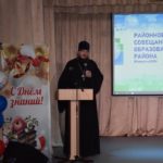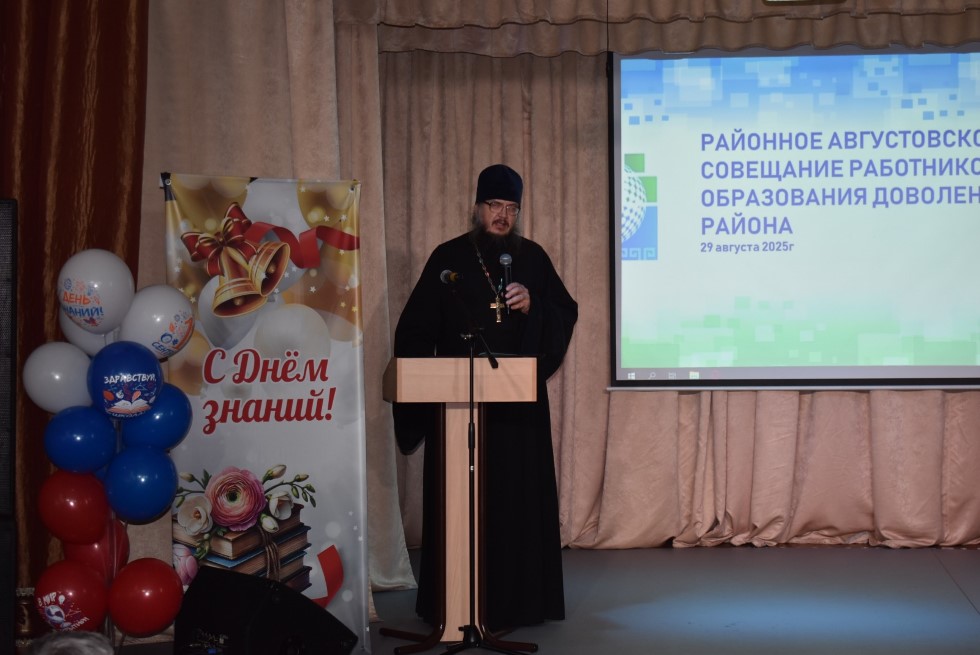 Настоятель храма во имя прп. Сергия Радонежского с. Довольного протоиерей Андрей Гусев в своем выступлении подчеркнул важность воспитательной работы учителей и выразил надежду на сотрудничество в этом вопросе образовательных учреждений и Доволенского прихода.