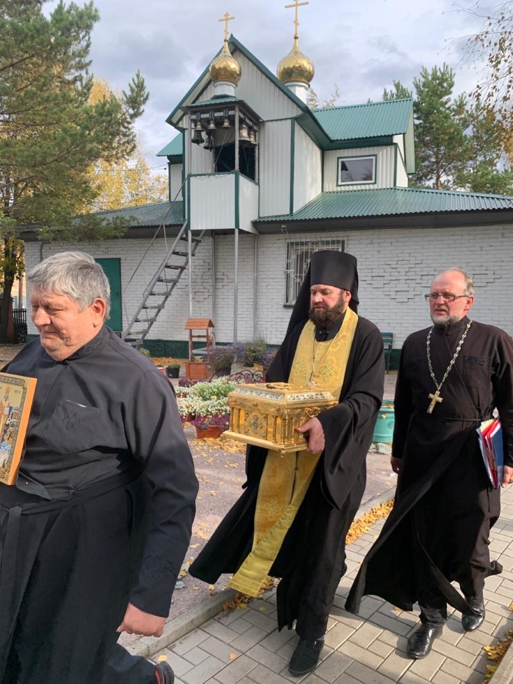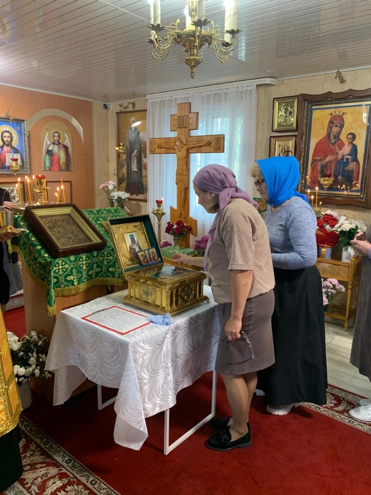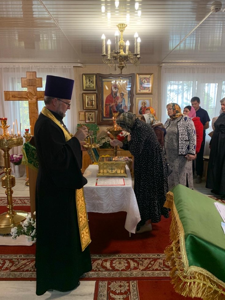 По завершении молебна святыня была доставлена крестным ходом в храм во имя прп. Сергия Радонежского р. п. Краснозерское, где ее тепло и радостно встретил настоятель храма протоиерей Евгений Зверев с прихожанами храма.