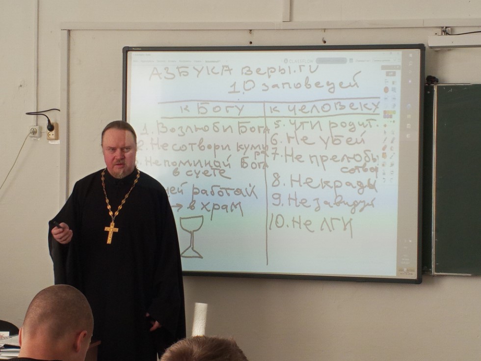Иерей Михаил рассказал обучающимся о десяти заповедях Божиих, церковных праздниках и Церковных Таинствах.
