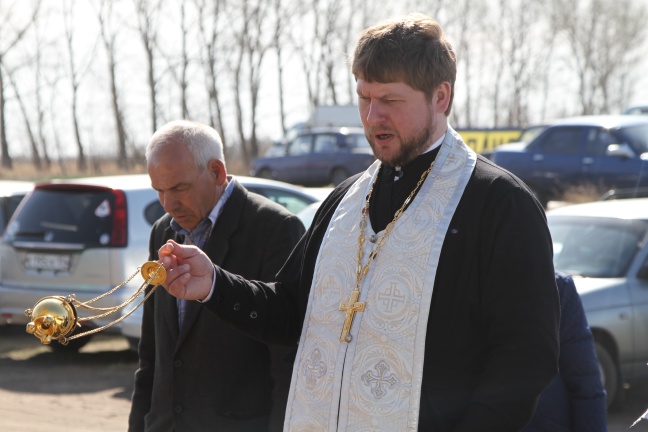 После панихиды на кладбище, батюшка Роман отслужил молебен возле фундамента строящегося храма-часовни преподобного Сергия Радонежского, а затем и возле могилы первого Карасукского священника иерея Алексея Тюменцева.