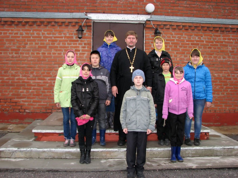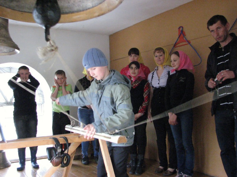 Наш звонарь, двенадцатилетний Николай, сын батюшки Романа, с удовольствием продемонстрировал своё искусство колокольного звона. И каждому желающему преподал первый урок этого ремесла. Сельские ребята быстро нашли общий язык с нашим юным звонарём, так как они по возрасту являются ровесниками.