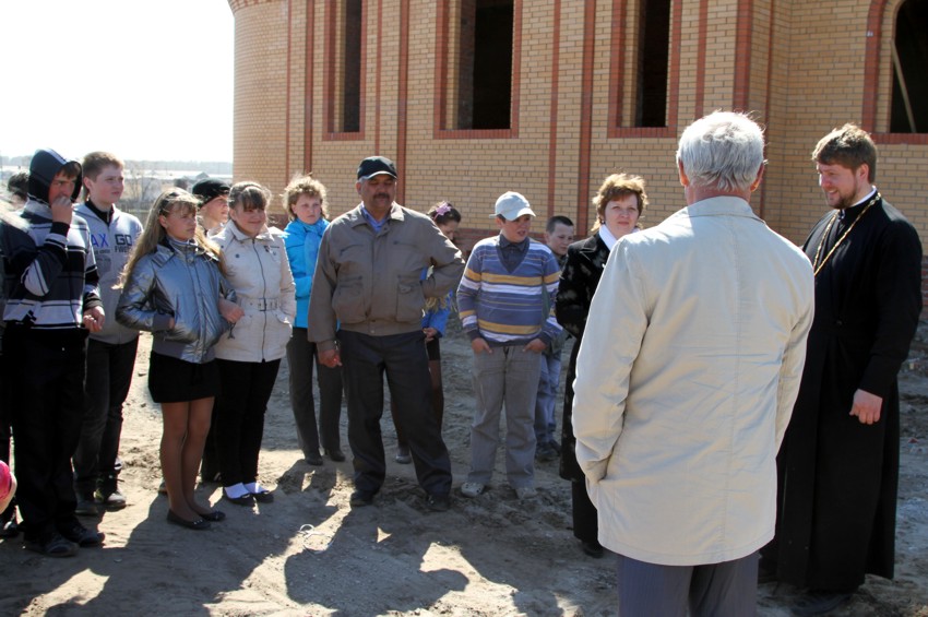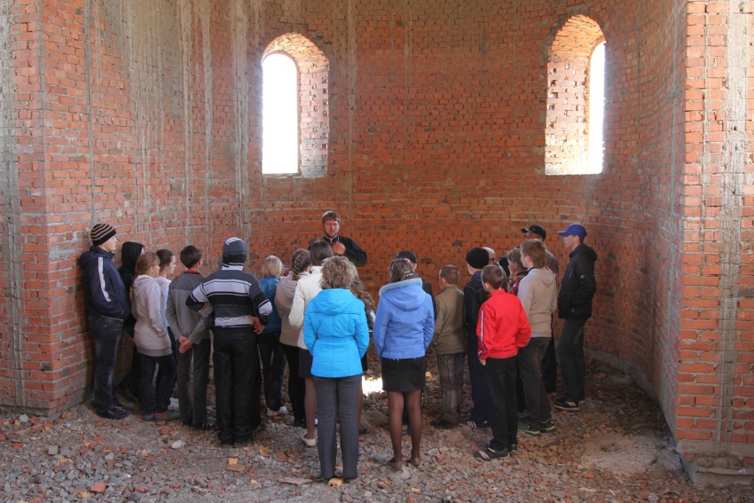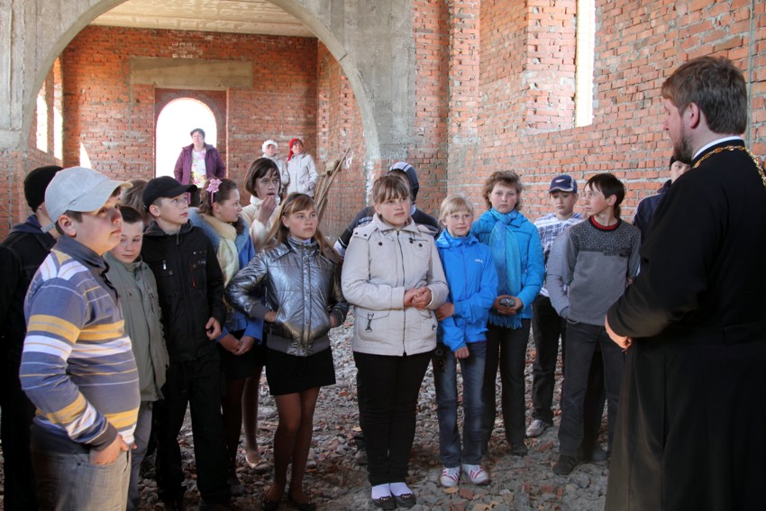 Здесь же, в недостроенном храме, батюшка Роман встретился с учащимися Мироновской школы и провел открытый урок. Ребята познакомились с внутренним устройством Православного Храма, постояли на месте будущего алтаря, узнали о правилах поведения в храме, таинствах и обрядах Русской Православной Церкви.