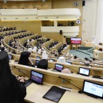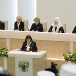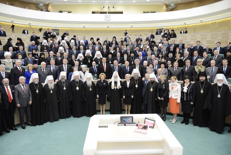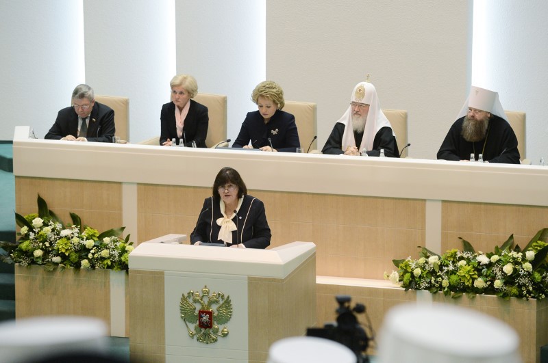Заседание открыла В.И. Матвиенко. Он поблагодарила Святейшего Патриарха «за большой личный вклад в развитие межнациональных и межрелигиозных отношений в стране, за роль духовного лидера в соработничестве Русской Православной Церкви с государственными и общественными институтами в сфере культуры и образования, воспитания молодежи и укрепления семейных ценностей».
