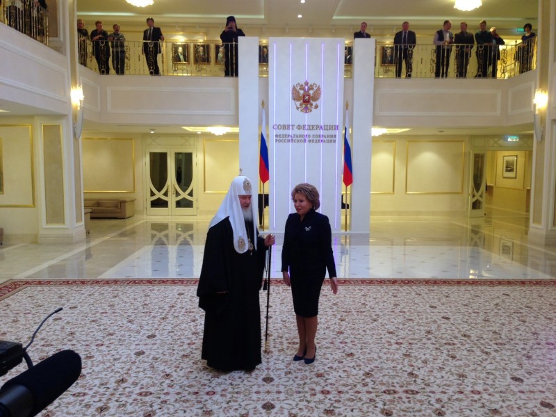 У входа в здание верхней палаты российского парламента Его Святейшество встречали председатель Совета Федерации В.И. Матвиенко, первый заместитель председателя Совета Федерации А.П. Торшин, председатель Синодального отдела религиозного образования и катехизации митрополит Ростовский и Новочеркасский Меркурий и председатель Синодального отдела по взаимоотношениям Церкви и общества протоиерей Всеволод Чаплин.