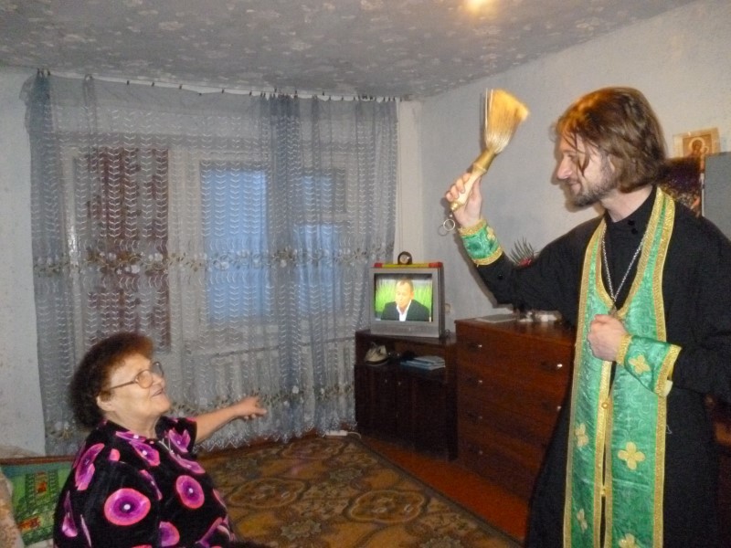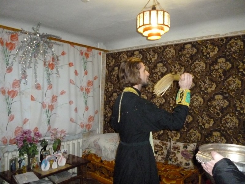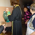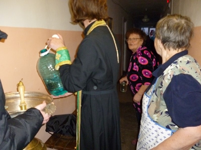 Иерей Сергий Шишов, чьим небесным покровителем и является преподобный Сергий, окропил крещенской водой все жилые помещения, и все старички получили в подарок иконы. Некоторые исповедовались, а некоторые и пополнили свои домашние запасы святой крещенской.водой, которую священник обильно раздавал всем тем, кто по немощи не смог сам прийти в день праздника Крещения Христова в Собор и почерпнуть святыни.