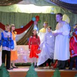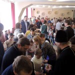 После концерта Владыки окропили всех святой водой, раздали иконы, пасхальные яйца и сладкие подарки и поздравили детей с праздником Святой Пасхи.