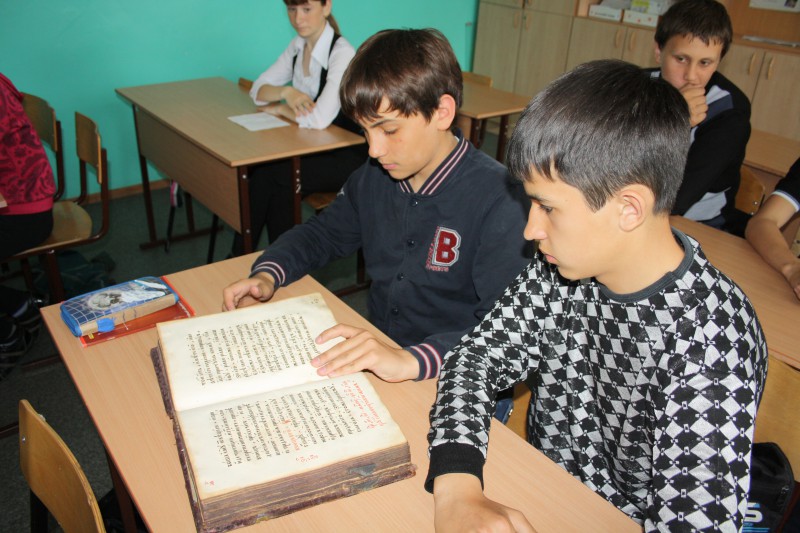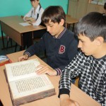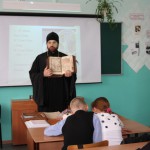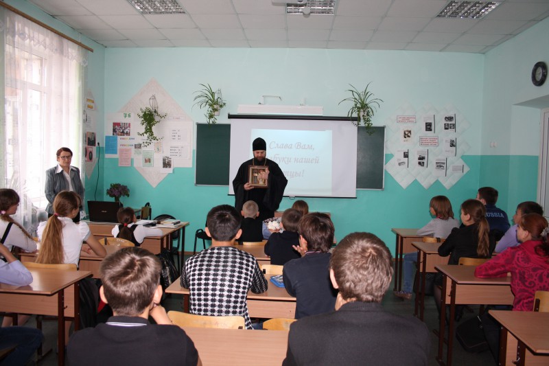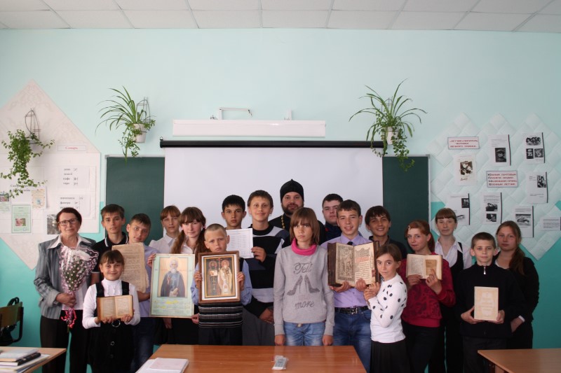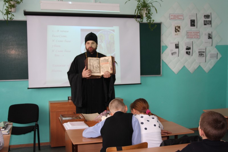 Гостем этого мероприятия был благочинный Центрального округа Карасукской епархии иеромонах Мелхиседек (Свистелин). С большим интересом ребята слушали его выступление о значении азбуки, созданной святыми Кириллом и Мефодием, о том, что, благодаря созданию письменности, появилась возможность передавать из поколения в поколение накопленный опыт, Слово Божие переведено на славянский язык и стало доступно. Рассматривали церковно-славянскую азбуку, бережно передавали из рук в руки Евангелие, датированное 1628 годом, одним из памятников древности, хранящимся в храме во имя святого апостола и евангелиста Луки.