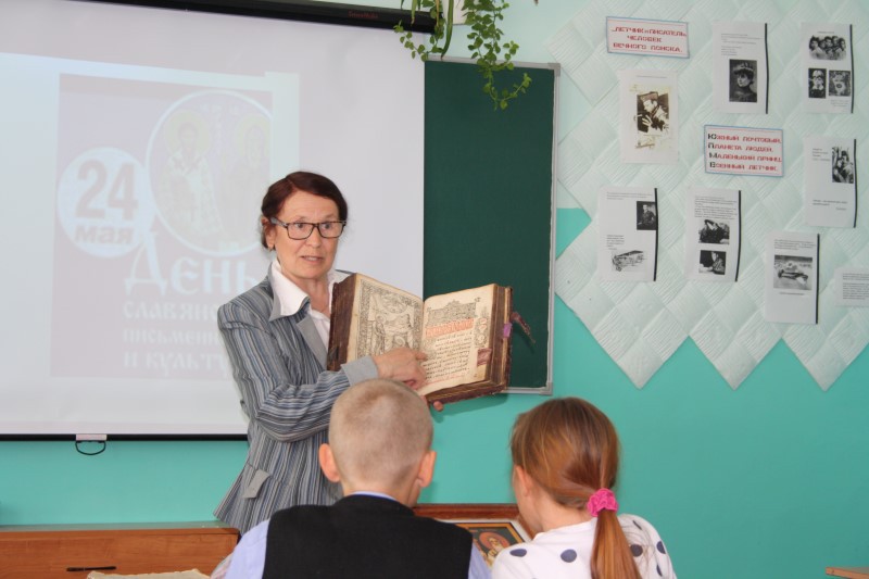 Классный руководитель Нина Михайловна Хоменко рассказала об истории возникновения письменности, о подвиге братьев-просветителей, о их нелёгком жизненном пути.