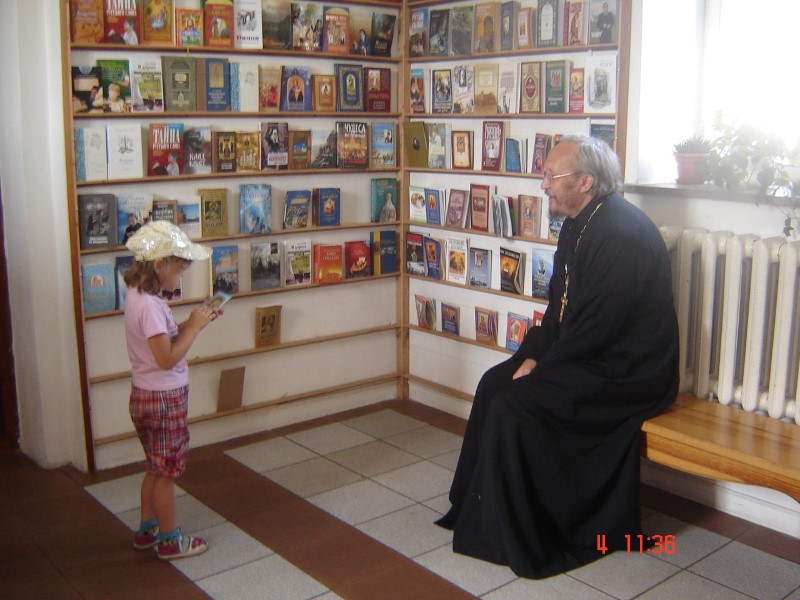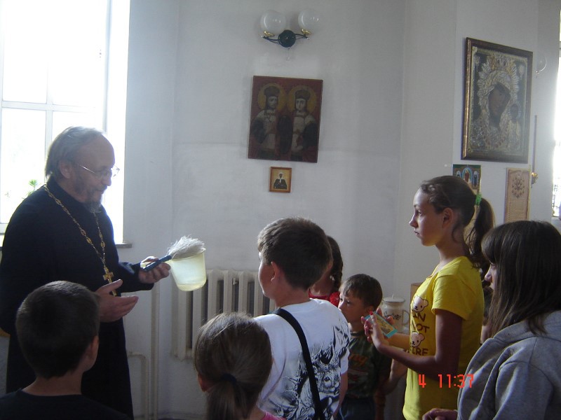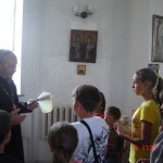 Протоиерей Александр Лупарев рассказал детям о храме, о заповедях Божиих, о духовных законах человеческой жизни. Показал иконы святых. Желающим раздал иконки Пресвятой Богородицы с молитвами.