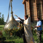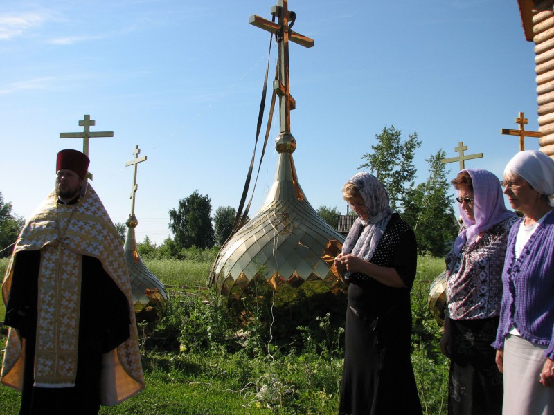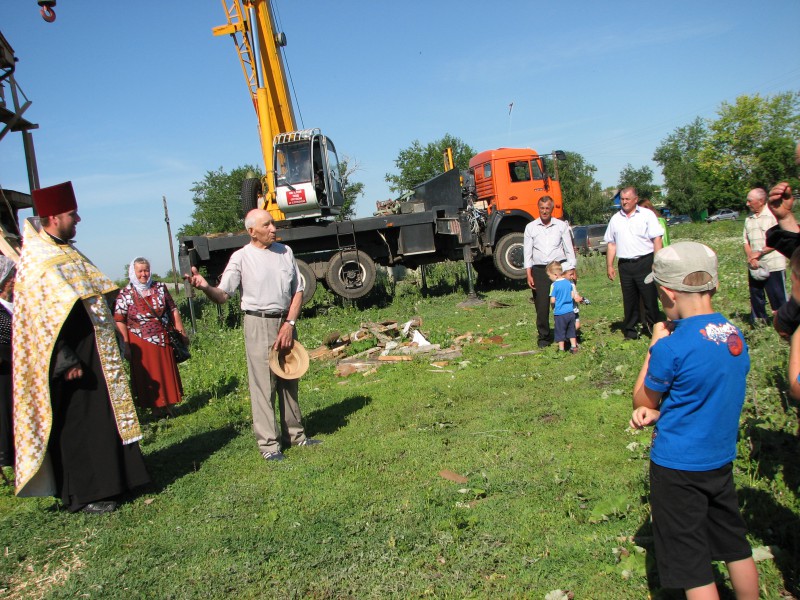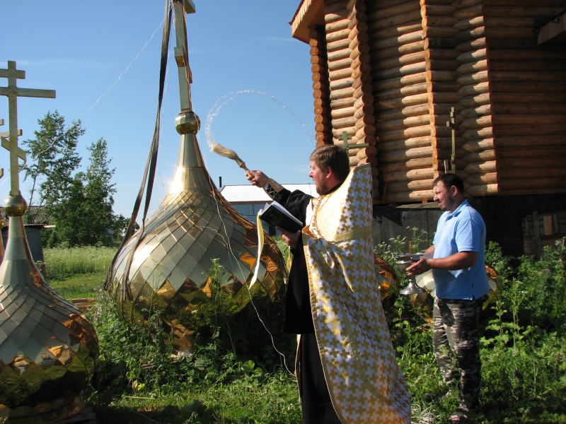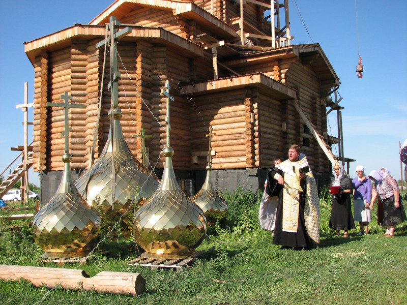 После освящения крестов священник и народ с радостью и благоговением целовали Святой Крест. После чего строители стали производить установку на храм главного купола с крестом.