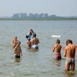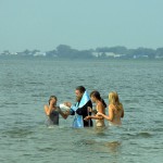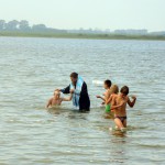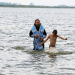 Священнослужители освятили воду в озере и Владыка вошел в воду. Иерей Игорь и иерей Сергий помазывали детей на берегу святым маслом и святым миром, а епископ Филипп, стоя по пояс в воде, совершал Таинство Крещения всех детей с полным погружением в Благодатном озере.