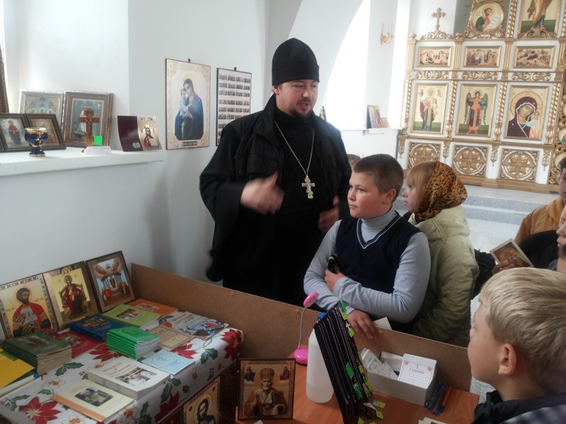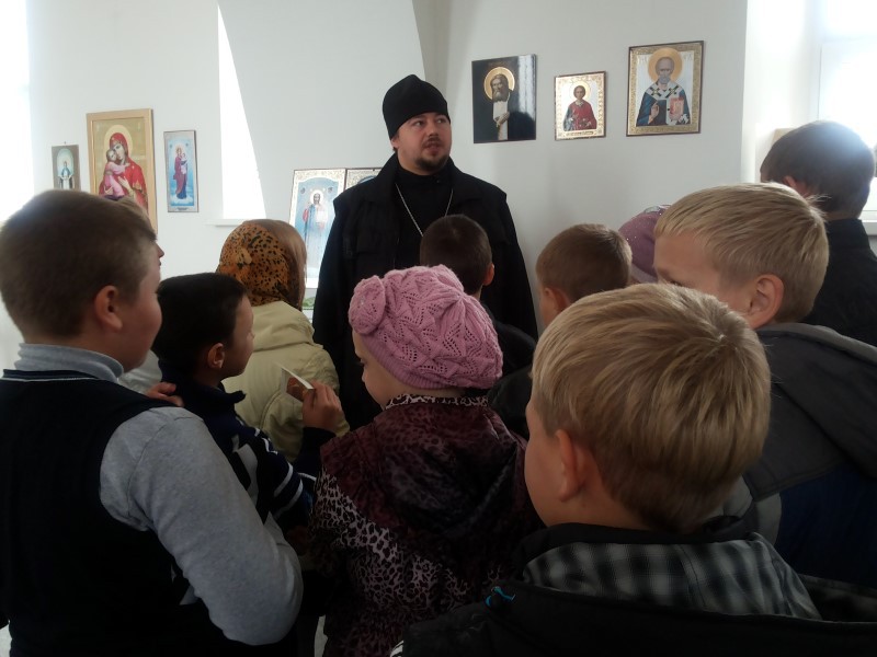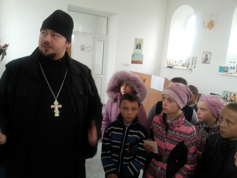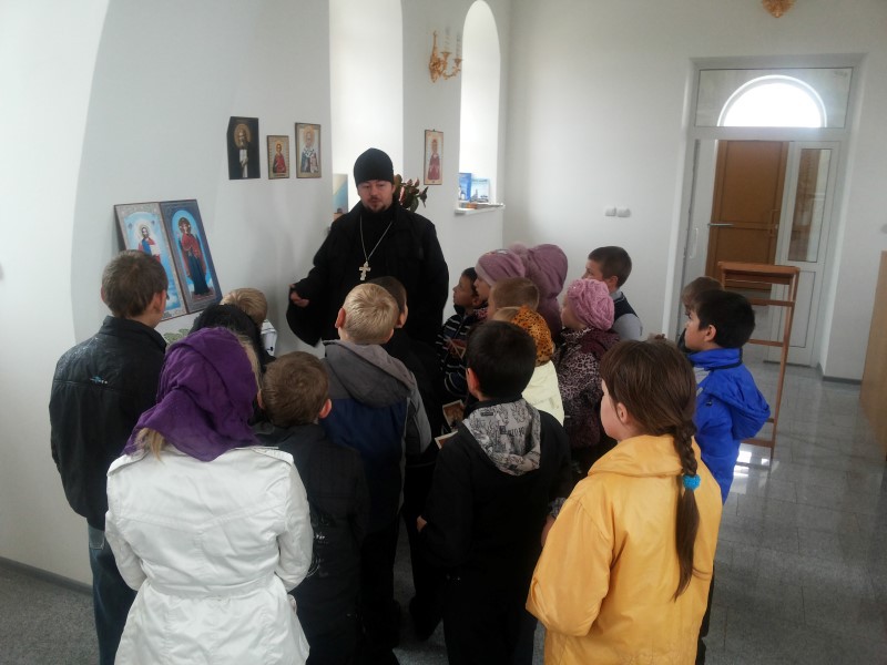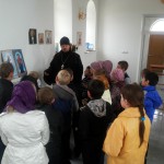 После чего состоялась экскурсия в храм во имя св. мцц Веры, Надежды Любови и матери их Софии. Батюшка рассказал детям о вере, Боге, Богородице и святых, об устройстве храма.