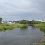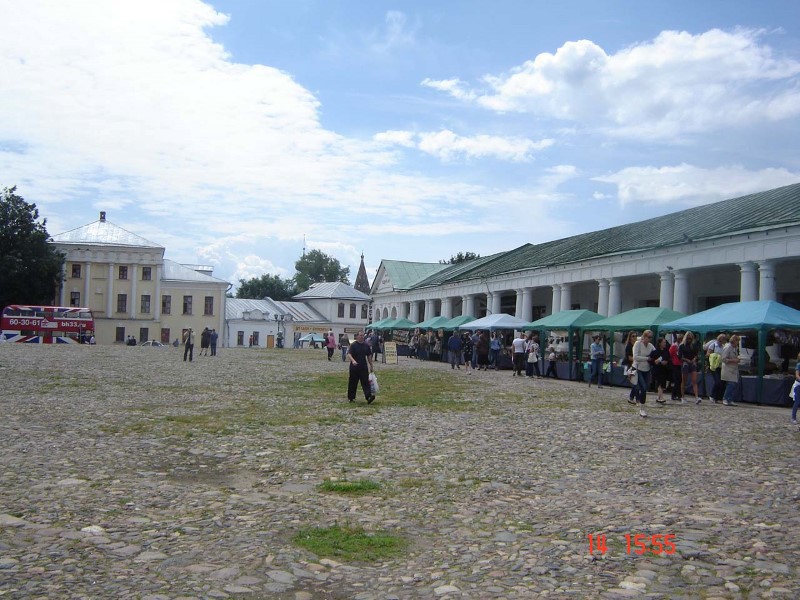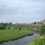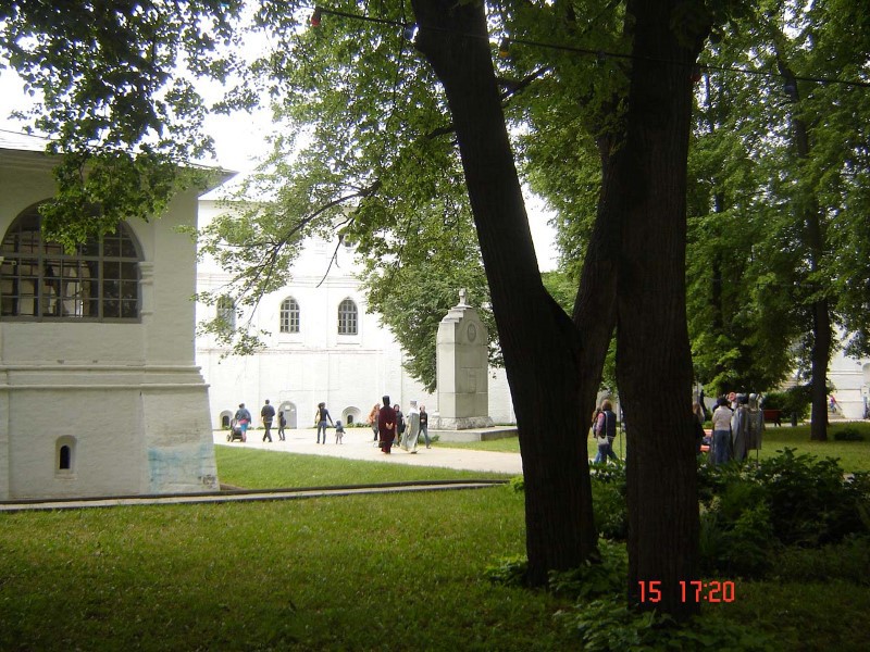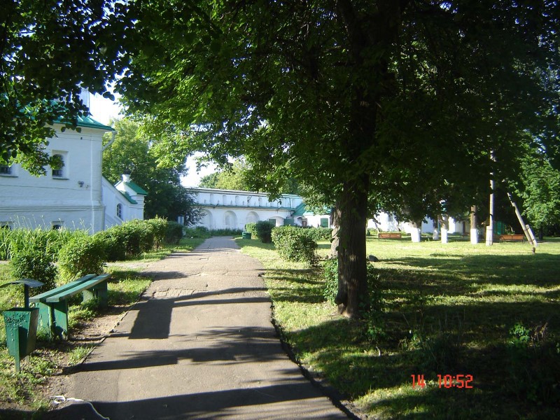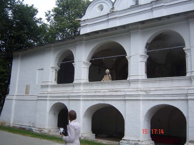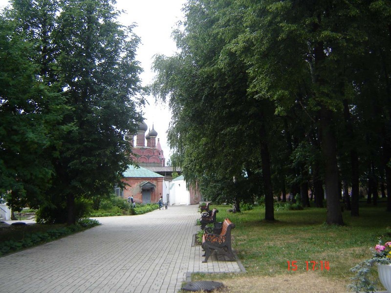 Когда подъезжали к нему, сразу открылся прекрасный вид на древние белокаменные монастыри за рекой. Въехали в центр и пошли пешком по булыжной мостовой к крепостному валу над рекой, с которого открылся удивительный вид сверху на древние монастыри. Прошли по тропинке над обрывом и вышли к кремлю, который существует с 10 века. Обошли водяной ров и вошли в Ризоположенский женский монастырь 1207 г. основания.