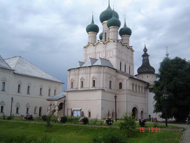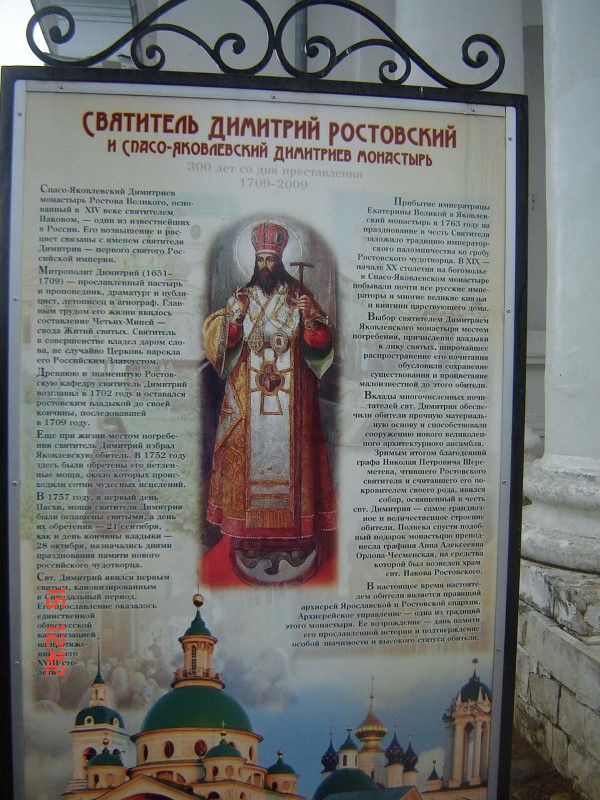 Едем в Ростов Великий. Издалека выискиваем глазами храмовые комплексы. Увидели. Подъезжаем. Спасо-Яковлевский монастырь, основан в 14 веке. Идем на Литургию. По ее окончании с большим изумлением узнаю, что молился в храме во имя святителя Димитрия Ростовского, написавшего многотомный труд «Жития святых».