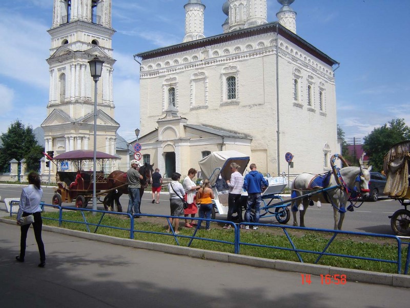 Транспорт Суздаля — это, в основном, конские экипажи. Как будто попадаешь в средние века. Возвращаемся в центр Суздаля, где нас ждет москвич Юрий, с которым учились вместе на физфаке в НГУ. Он уже не раз бывал здесь, поэтому спал в машине после бессонной ночи. Едем во Владимир, который расположен в 26 км от Суздаля.