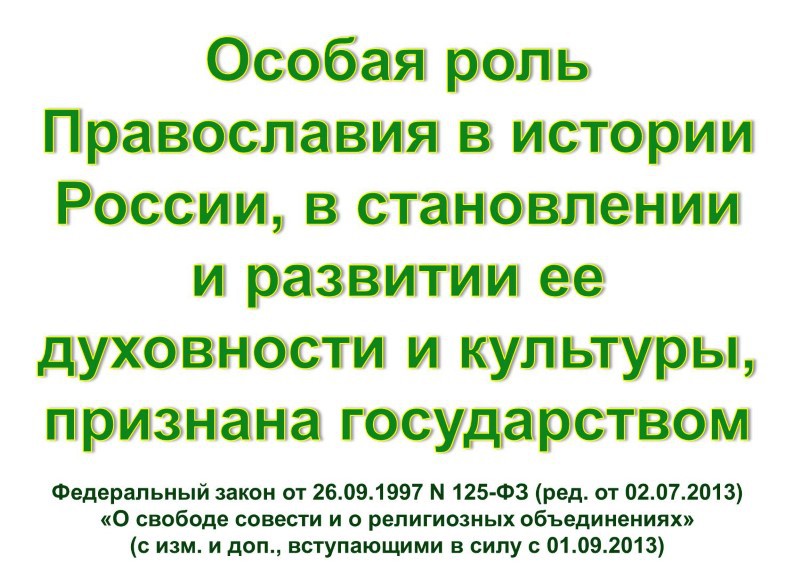 Особая роль Православия в истории России, в становлении и развитии ее духовности и культуры, признана государством Федеральный закон от 26.09.1997 N 125-ФЗ (ред. от 02.07.2013) «О свободе совести и о религиозных объединениях» (с изм. и доп., вступающими в силу с 01.09.2013) |