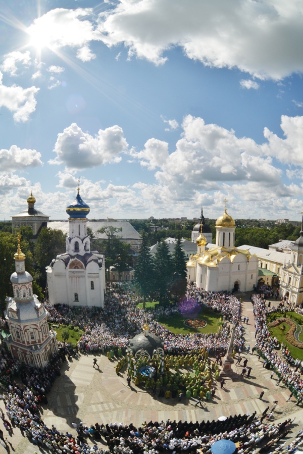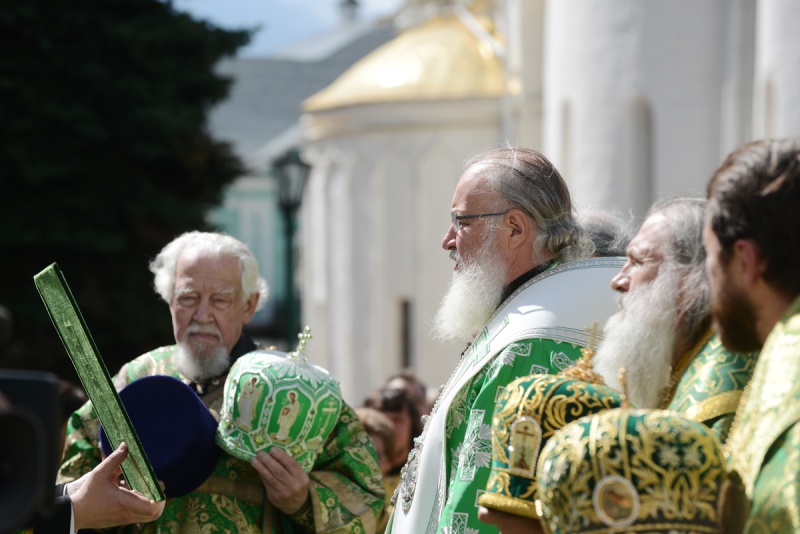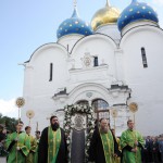 По окончании Литургии Святейший Владыка возглавил крестный ход и совершил молебен на Соборной площади лавры перед чтимой иконой преподобного Сергия Радонежского. За молебном Его Святейшеству сослужил собор иерархов, совершавших сегодня Литургию во всех храмах Троице-Сергиевой лавры.