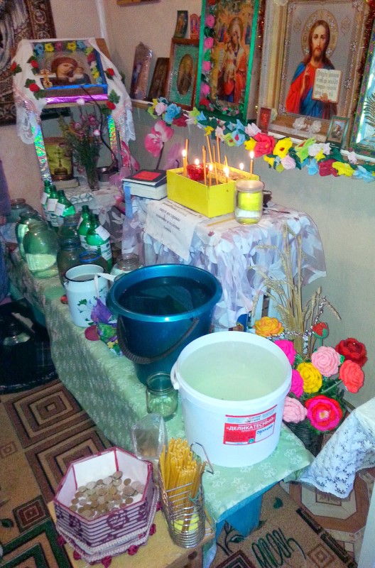 Вся маленькая часовня была уставлена сосудами с водой: люди со всего села принесли сюда свои бидончики и баночки в надежде получить по вере своей помощь Великого Бога. Священник отслужил молебен и окропил святой водой радостных людей и маленький храмик.