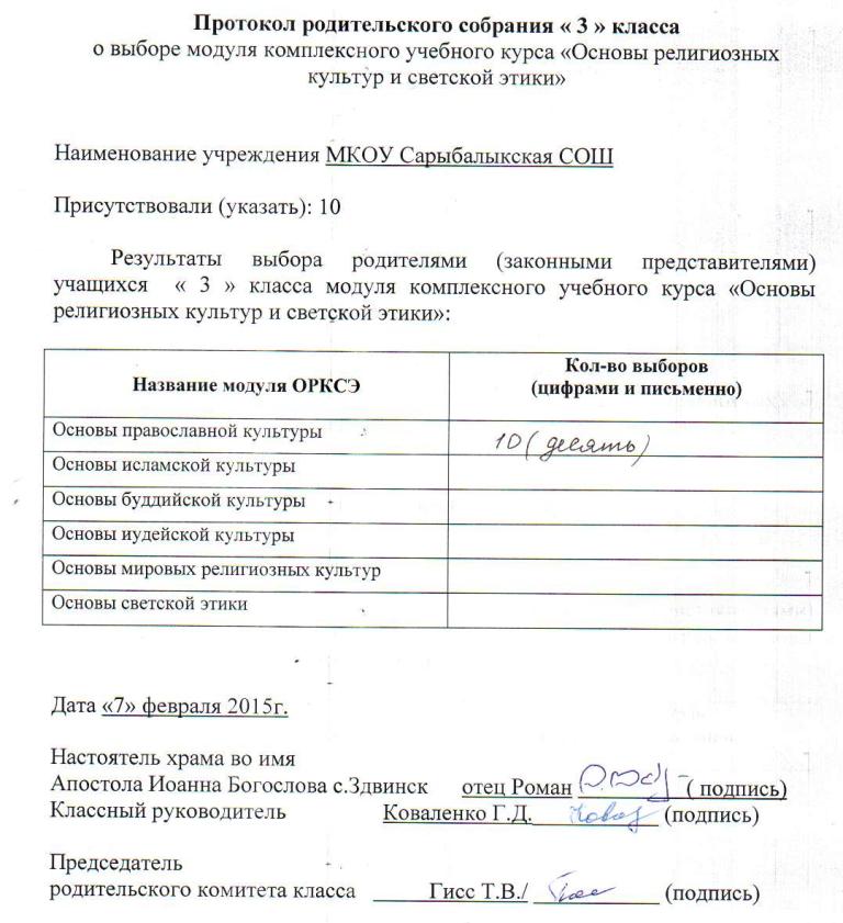 7 февраля 2015 г. в МКОУ Сарыбалыкская СОШ села Сарыбалыка Здвинского района проходило родительское собрание, связанное с выбором модуля ОРКСЭ в 3-ем классе, (протокол собрания приведен ниже).