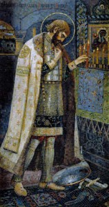 В облике святого князя у Нестерова не воинская доблесть, не удаль богатырская, а смирение перед волей Божией, готовность к покорному исполнению возложенного на него долга. Лежит небрежно брошенное под ноги оружие. В руках у князя — свеча. Голова склонена на грудь, глаза закрыты — он молится. Образ святого наполнен поразительной молитвенной сосредоточенностью, тишиной, искренним сердечным чувством.