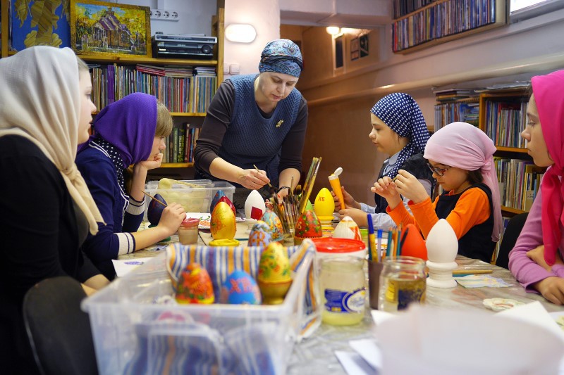 Вместе со своим любимым преподавателем Ксенией Борисовной Лебедевой девочки начали создавать художественные пасхальные сувениры — разрисовывать большие деревянные яйца. В работе учитывается и научный подход: были изучены исторические традиции, были внимательно рассмотрены образцы, нарисованы цветные эскизы и только после одобрения своего маленького общего «внутривоскресно-школьного» художественного совета дети взялись за деревянные заготовки всерьез.