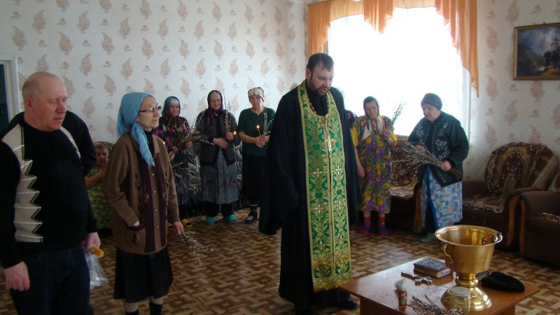 Иеромонах Мелхиседек поздравил всех живущих дома с праздником и совершил молебен с освящением верб.
